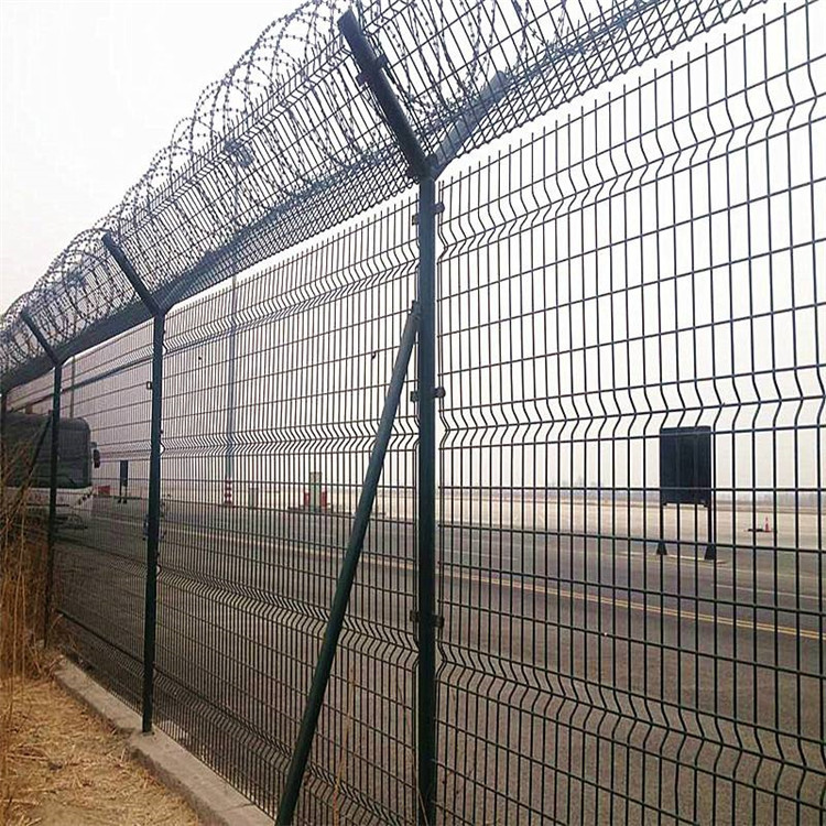 機(jī)場(chǎng)隔離網(wǎng)的安裝要求護(hù)欄網(wǎng)的整體安裝高度要3米以上,網(wǎng)片與網(wǎng)片間隙不能大于10公分,立柱與網(wǎng)片連接離地部分不能大于5公分,立柱垂直高度為3.5米,每套安裝整齊劃一,機(jī)場(chǎng)隔離網(wǎng)上部分采用60直徑的熱鍍鋅刀片刺繩,刺繩的刀片與刀片間隔為20cm。正常的情況下每米出1.2kg左右的刺繩。安裝的同時(shí)采用卡扣卡在V型網(wǎng)上面。這樣有利于熱鍍鋅刀片刺繩的穩(wěn)固性能。