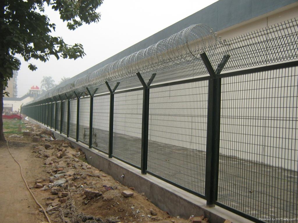 監(jiān)獄看守所防逃隔離網(wǎng)的參數(shù):立柱:80*80*2.5mm(塑后);邊框:30*50*1.5mm(塑后);網(wǎng)片:2.5-4*3米;網(wǎng)孔:50*50mm 50*100mm 75*150mm;底盤:150*150*8mm;表面處理:浸塑 噴塑 鍍鋅處理;刀刺:500mm圈徑蛇腹型刀刺網(wǎng)。