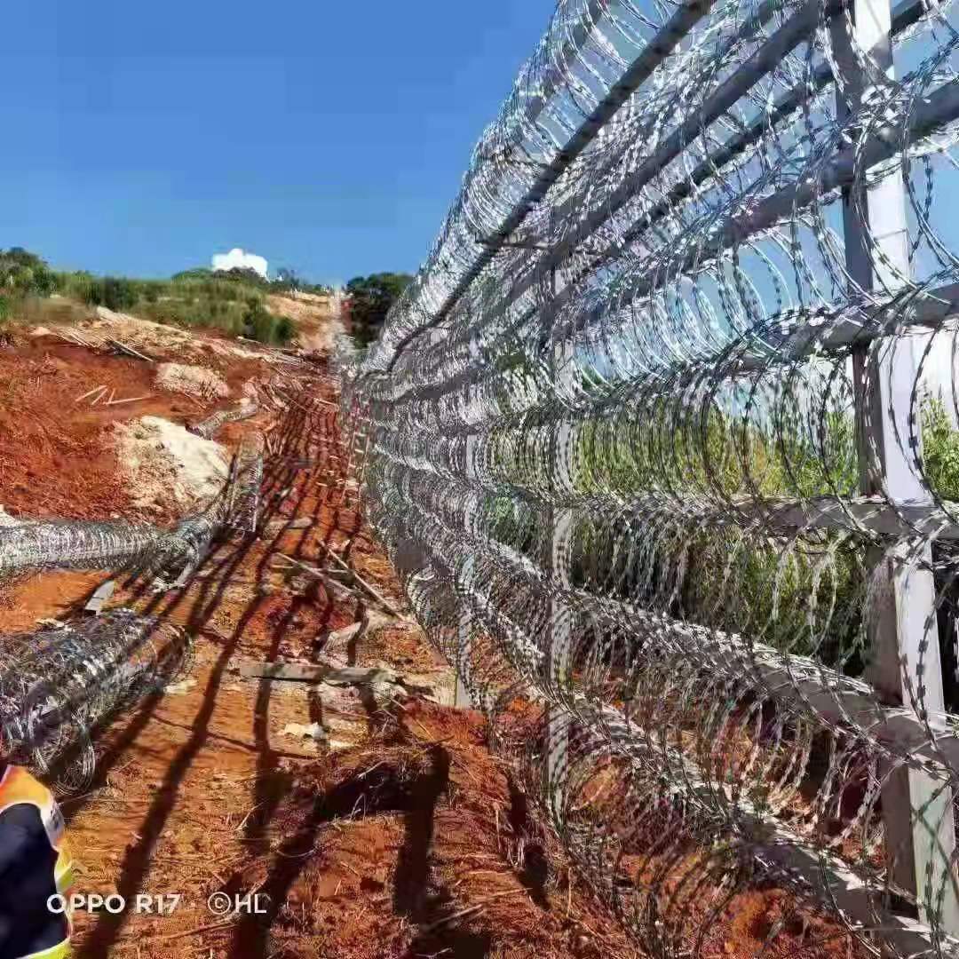 一圈一圈鐵絲上有鋒利的小刀片,強(qiáng)闖的話會(huì)在皮膚上劃開(kāi)很多小口,不及時(shí)救治就會(huì)傷口感染、嚴(yán)重的是流血過(guò)多而死。一般情況下,想要快速通過(guò)這個(gè)鐵絲網(wǎng),需要使用爆破筒,但是這會(huì)驚動(dòng)邊防官兵。用鉗子慢慢剪也可以,但是監(jiān)控設(shè)備和無(wú)人機(jī)會(huì)發(fā)現(xiàn)。而且我國(guó)的蛇腹型鐵絲網(wǎng)是立在柵欄上面的,剪的話會(huì)很難操作,耗時(shí)耗力